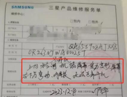 梁先生提供的当天物流系统信息显示,2023年12月1日11点17分,物流信息显示签收完毕。梁先生拍摄的验收视频手机系统时间则显示,11点22分还在进行拆装验收。12月4日,三星售后人员检测后发现,系电视机屏幕受力变形,屏幕右下方弯曲,内屏裂,无法正常开机。
