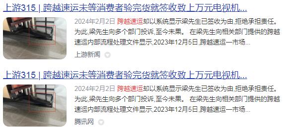 江苏的梁先生购买了1万多元的三星新款电视机,在验收时发现无法开机。因跨越速运派件员在未完成验收的情况下就在系统中标注签收,导致受损电视机无法索赔。从2023年12月1日至今,梁先生几次投诉仍没有结果,其获得的物流公司内部处理流程显示,估计因其多次打投诉电话,还被要求拉黑手机一周。