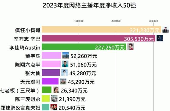来自东方甄选的董宇辉收入排名第四,为5.226亿元。陈翔六点半和张大仙的净收入均在5亿元左右,来自三只羊的七老板和嘴哥、旭旭宝宝、烈儿宝贝、papi酱、芜湖大司马等均进入了前20名。此外,PDD、冯提莫、罗永浩等进入了榜单前50名。