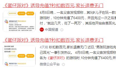 4月8日晚,一名父亲发视频称,其9岁儿子在玩一款名为《蛋仔派对》的游戏时,10分钟充值了6400元,并且充过一次之后系统就自动免密支付,“就这几天,花了一两万”,其后他开始自扇耳光。4月9日下午,《蛋仔派对》游戏方网易游戏相关工作人员回应媒体采访时称,经核查,该用户为华为渠道账号,经与华为公司沟通协调,已安排全额退款。