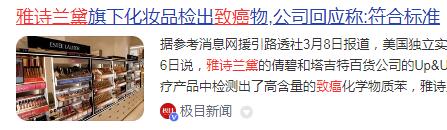 年初雅诗兰黛旗下产品在美国检出高浓度致癌物苯、多个知名品牌被卷入致癌风波,包括雅诗兰黛、沃尔玛、利洁时、欧莱雅、强生等!随后雅诗兰黛称在中国销售的所有产品合规。此后雅诗兰黛相关负责人回应记者称,雅诗兰黛在中国销售的所有产品均符合国家相关标准和法律法规。