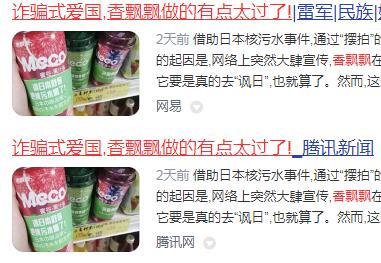 但是,香飘飘没有这个本事,却非要去吃“爱国”这碗饭。借助日本核污水事件,通过“摆拍”的方式,搞诈骗式爱国营销。事情的起因是,网络上突然大肆宣传,香飘飘在日本某门店销售“讽日”式奶茶。它要是真的去“讽日”,也就算了。然而,这却是一场“爱国流量”的骗局。人家日本京和商店太久保店亲自出来辟谣了:“没有卖过相关字样杯套的奶茶。”
