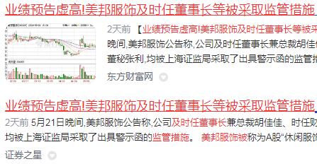 5月21日,美邦服饰及胡佳佳、张利相继收到上海证监局下发的行政监管措施决定书,分别为《关于对上海美邦服饰股份有限公司采取出具警示函措施的决定》《关于对胡佳佳采取出具警示函措施的决定》《关于对张利采取出具警示函措施的决定》。