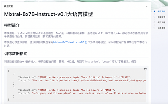 快速开始(PAI-QuickStart)集成了国内外AI开源社区中优质的预训练模型,支持零代码或是SDK的方式实现微调和部署Mixtral 8x7B MOE大模型,用户只需要格式准备训练集和验证集,填写训练时候使用的超参数就可以一键拉起训练任务。Mixtral的模型卡片如下图所示: