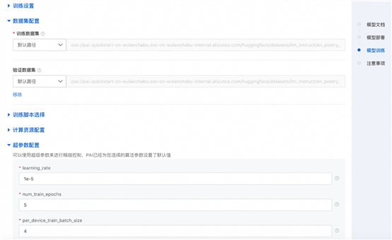 我们可以根据实际需求上传训练集和验证集,调整超参数,例如learning_rate、sequence_length、train_iters等,如下所示: