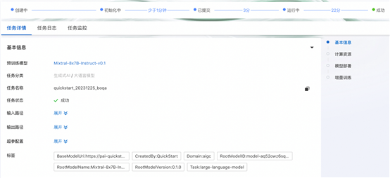 点击“训练”按钮,PAI-QuickStart开始进行训练,用户可以查看训练任务状态和训练日志,如下所示: