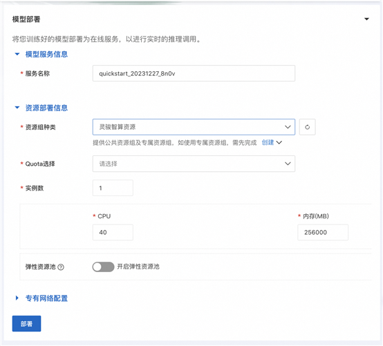 如果需要将模型部署至PAI-EAS,可以在同一页面的模型部署卡面选择资源组,并且点击“部署”按钮实现一键部署。模型调用方式和上文PAI-EAS调用方式相同。