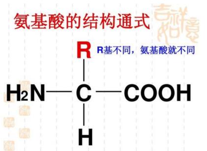 氨基酸是指含有氨基的羧酸。生物体内的各种蛋白质是由20种基本氨基酸构成的。构成蛋白质的氨基酸都是一类含有羧基并在与羧基相连的碳原子下连有氨基的有机化合物,目前自然界中尚未发现蛋白质中有氨基和羧基不连在同一个碳原子上的氨基酸。除甘氨酸外均为L-α-氨基酸其中(脯氨酸是一种L-α-亚氨基酸),其结构通式如图(R基为可变基团):